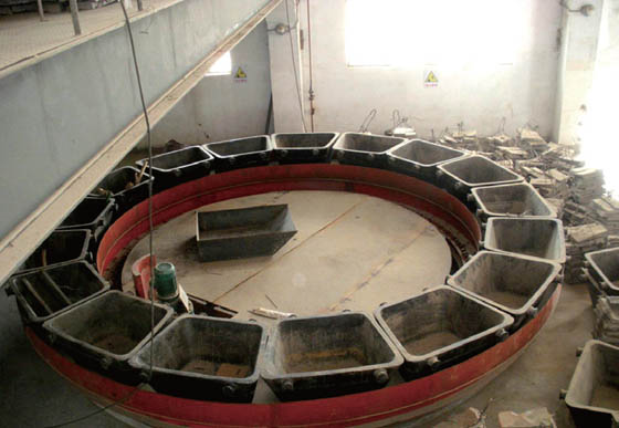 自主開發產品,由傳動裝置、圓盤、錠模等組成,能將熔煉爐放出的高溫熔融粗鉛澆鑄成約2t/ 塊的鉛錠。